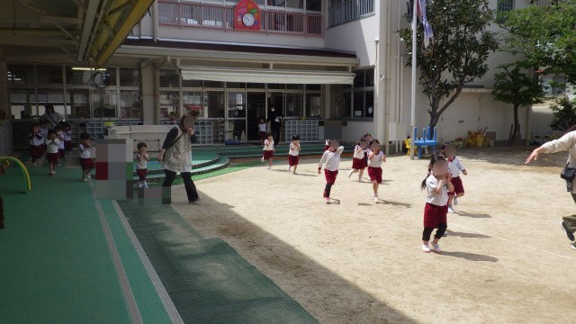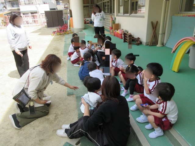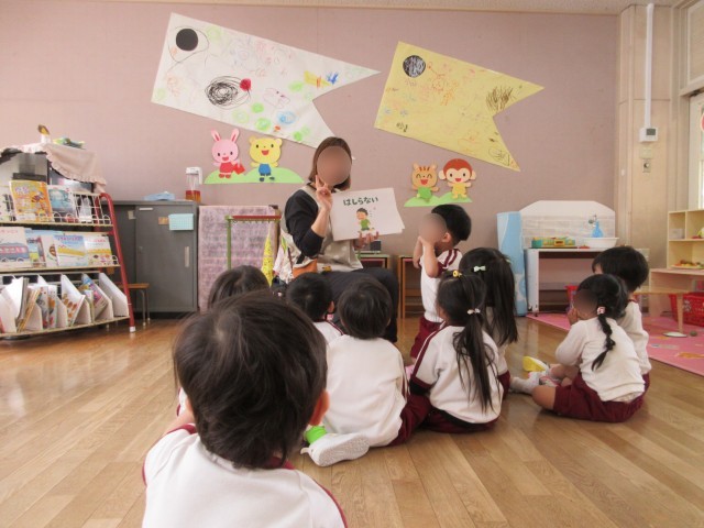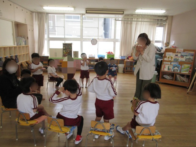 ベルが鳴ったら近くの先生の所に集まること、煙を吸わないようにハンカチで鼻と口を押えること、先生の指示に従って慌てず避難することを園長先生からお話ししてもらいました。災害はいつ起きるかわかりません。その時に自分の身を守れるよう、これからも引き続き子どもたちに伝えていきたいと思います。
