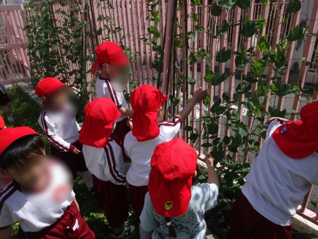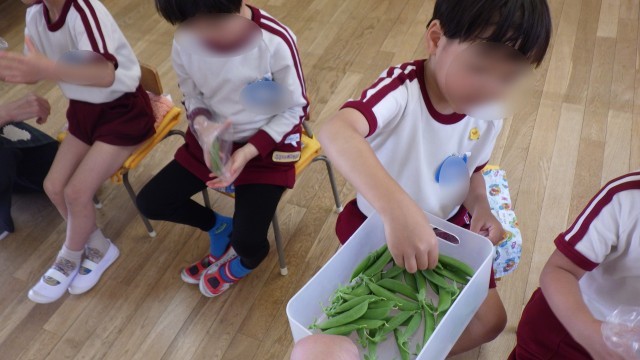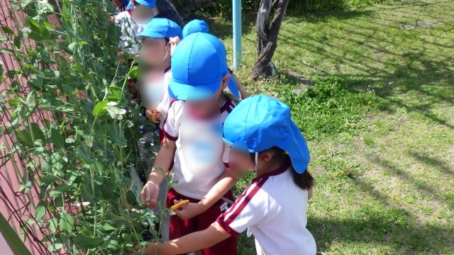 小園庭に移動して、スナップエンドウの観察と収穫。