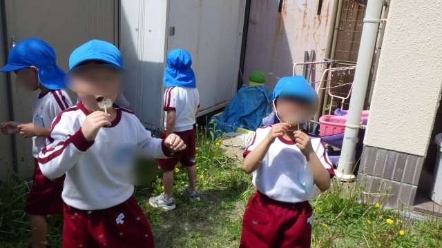 タンポポの綿毛に「フッ!」と勢いよく息を吹きかけると、綿毛ががふわっと舞い上がり、その度に子ども達の嬉しそうな笑い声が広がりました。