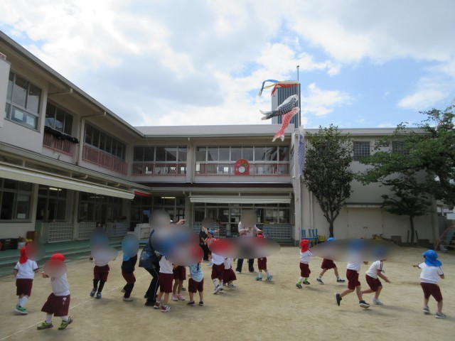 園庭に戻ってきてたくさん遊んだ後は、2クラス合同で新しい体操をしました。