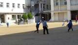鯰江小学校の広い校庭で思いきり走ってたこあげをしました。校庭のジャングルジムや鉄...