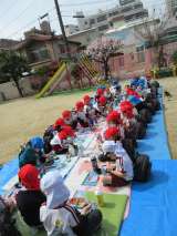 今日は、梅の花を見ながら、そら組(5歳児)とうめ組(4歳児)が一緒にお弁当を食べ...