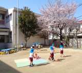 進級児(そら組)が新しい青色の帽子をかぶり、満開の桜の下で元気に遊びました。 チ...