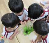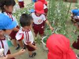 そら組(5歳)とうめ組(4歳)が一緒に夏野菜の観察に行きました。 「トマトが緑!...