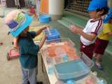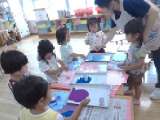 プール開きの前日、「やさいのプールびらき」の絵本を読んだ後、透明のプレートに絵を...