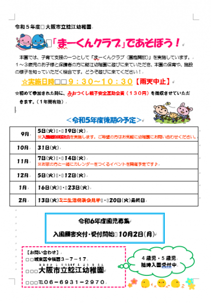 ☆まーくんクラブ(未就園児園庭開放)のお知らせ