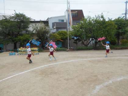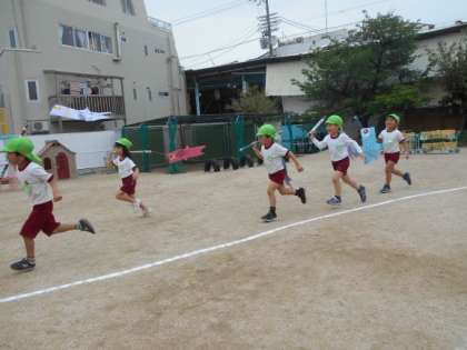 園庭には大きなこいのぼりが元気に泳いでいます。その姿に関心をもち、5歳児がこいのぼりをつくり、お部屋で泳がせて遊んでいました。「もっと広いところで泳がせたいな」という思いをもち、園庭に出て、こいのぼりと一緒にかけっこをしました。