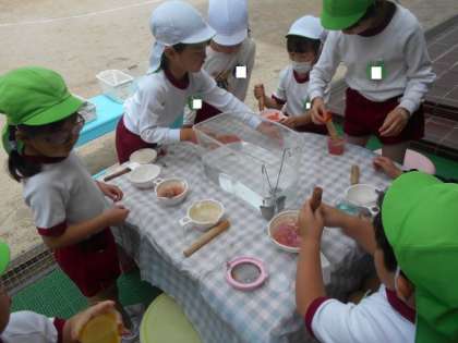 「明日はソーダジュースつくろう」「ジュース屋さんもしたいな」と明日への期待をもっていました。明日も楽しく遊びましょうね。