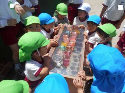園庭に咲いている花や実を使って、色水遊びを楽しんでいます。