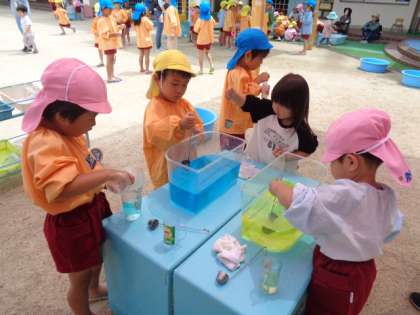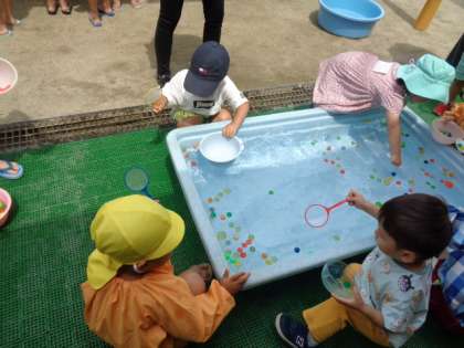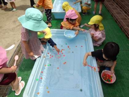 スーパーボールすくいや色水遊びなどで楽しく遊びました。
