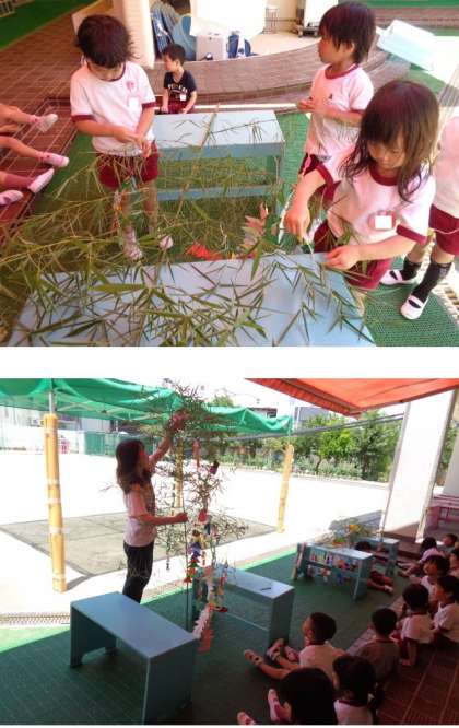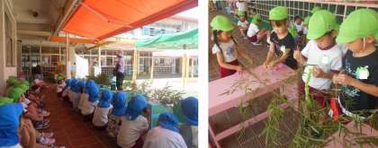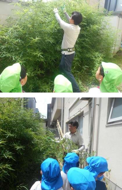 事業担当主事さんが裏庭の笹を採ってくれました。それを5歳児が幼稚園に運び、3・4歳児にもお知らせに行きました。