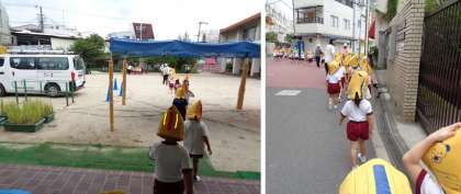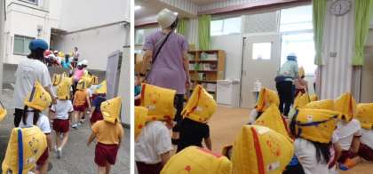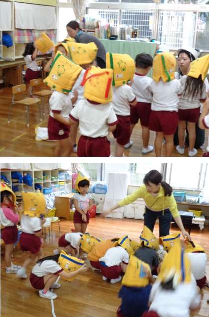 地震の合図とともに、防災頭巾を被り安全に園庭へ避難しました。