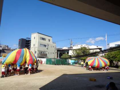 今日は、全園児でパラバルーンに挑戦しました。
