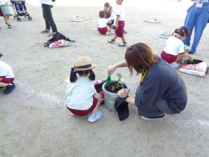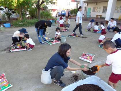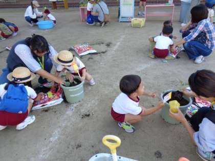 「ブロッコリーの赤ちゃんは、こんな形してるんだね」「大きくなるの楽しみだな」などお家の方と話しながら植えることができました。