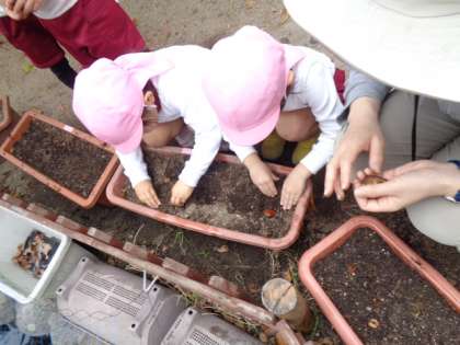今日は、4歳児さくら組がチューリップの球根を植えました。