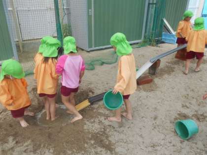 砂山に水を入れて足を浸したり、樋をつなげて水を流したりして、水や泥の感触を楽しみました。
