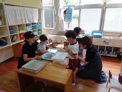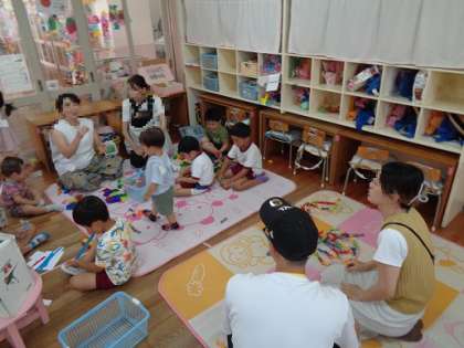 その後、4歳児さくら組の子どもたちが遊びに誘いに来てくれて、さくら組の部屋で遊んだり、一緒にカブトムシを見たりして楽しく過ごしました。