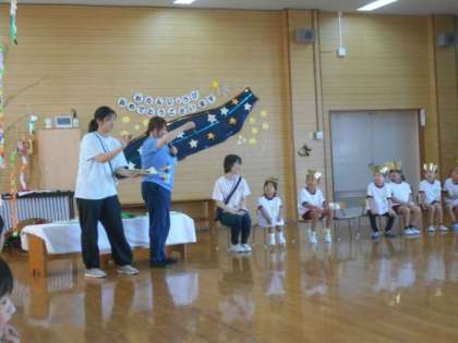 教師が七夕のお話を劇で見せ、織姫と彦星が会えた時は、子どもたちも喜んでいました。