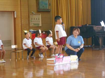 誕生会では、教師の「きらきら星」の合奏とともに、誕生児が天の川のペープサートをもち、みんなで歌いました。