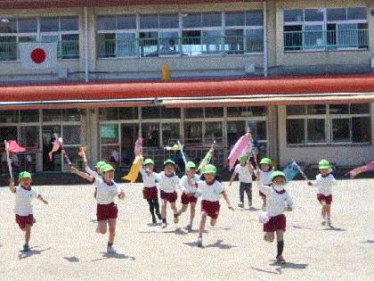 できたこいのぼりと一緒に走る5歳児のかわいい姿をご覧ください。