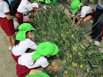 5歳児が幼稚園で育てたタマネギを収穫しました。