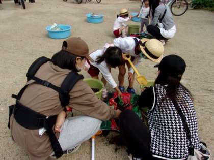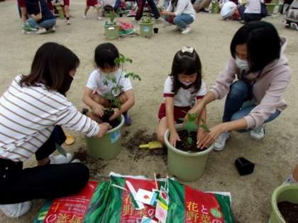 3歳児はミニトマト、4歳児はピーマン・ミニトマトのどちらか好きな野菜、5歳児はピーマン・ナス・ミニトマトから好きな野菜を1つ選び保護者と一緒に植えました。