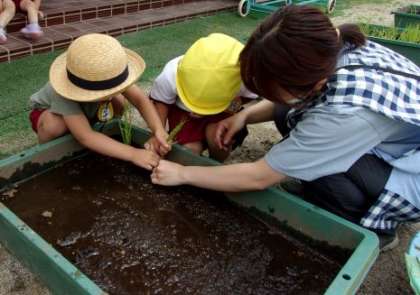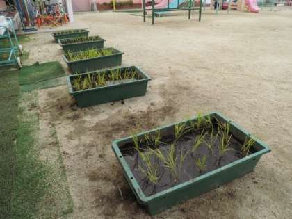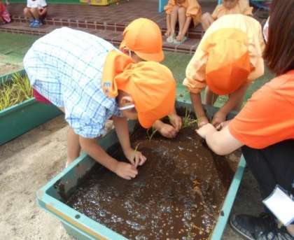 みんなで土づくりした田んぼに「お米になあれ」と声をかけながらイネを植えました。