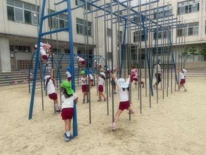 小学校の給食の時間に校庭をお借りしています。4歳児は初めて小学校に行きました。