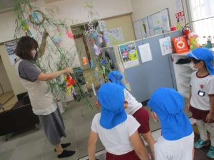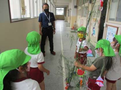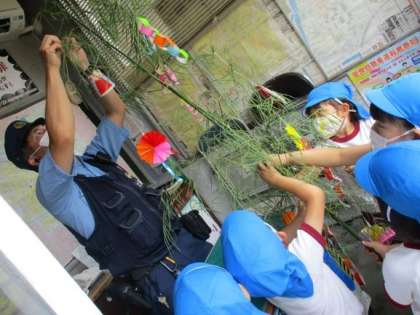 今日、5歳児が城東小学校と福祉会館、交番に笹のおすそ分けに行きました。