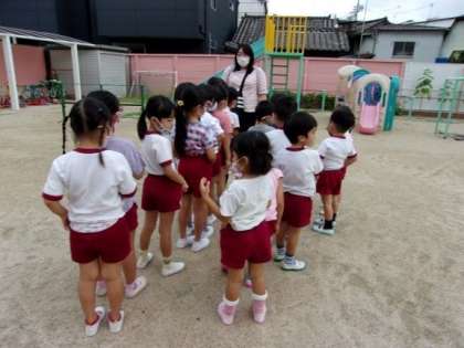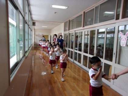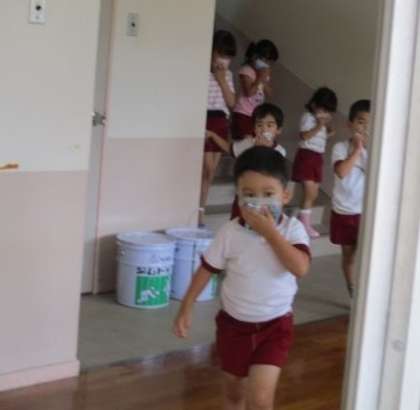 今日は一時預かり保育での火災を想定した避難訓練を行いました。子どもたちはハンカチで鼻と口を覆い、しっかりと約束を守って先生と一緒に避難しました。