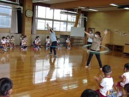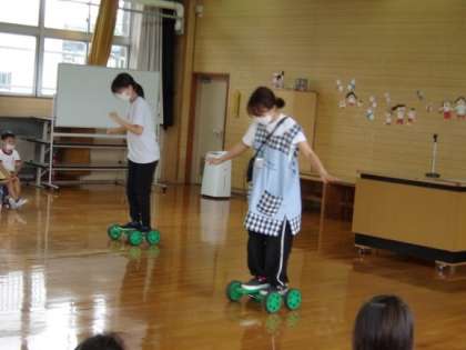 先生達は、短縄跳び、大縄跳び、竹馬、ペダルローラー、フラフープ、一本歯下駄に挑戦しました。子どもたちも「挑戦したい!」と、これからの幼稚園での活動に期待をもつことができました。