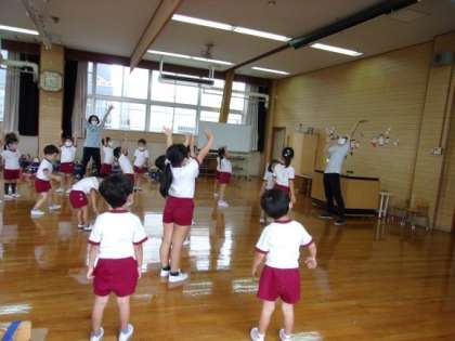 始業式では、園長先生のお話を聞いたり、先生達が色々な遊びに挑戦する姿を見たり、全員で体操したりしました。