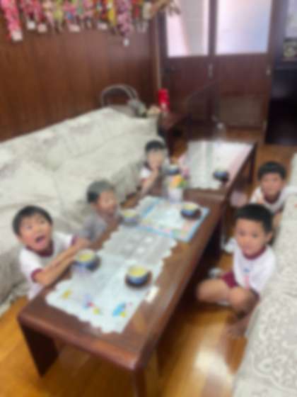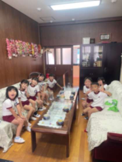 「緑茶」を初めて飲む子どもの反応は、「緑のお茶?」「美味しい」と喜んで飲んだり、味が苦手な子どもは無理せず一口だけ飲んだりしています。園長室で誕生児だけで集まる特別感が嬉しく、賑やかな園長室でした。