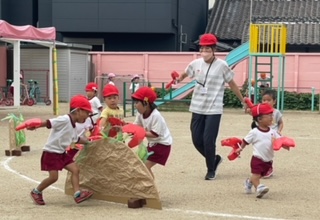 3歳児は1学期から見たり、触れたりしながら大切にお世話をしてきたザリガニに変身して遊んでいます。泳いだり、水草を食べたり、身体を洗ったりなど、大きな爪をつけて、いろいろな表現遊びを楽しんでいます。
