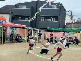 5歳児の様子です。リレーで転倒するハプニングもありましたが、立ち上がり、最後まで力一杯バトンをつないでいました。