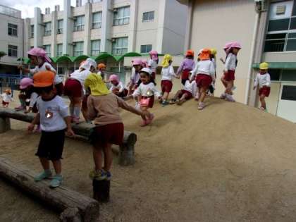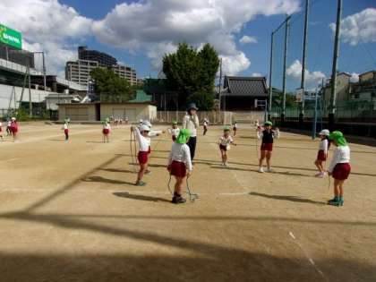 広い校庭で、体操をした後、縄跳びをしたり、幼稚園よりも高い砂山を一所懸命に登ったり、雲梯に挑戦したりなどして楽しく遊びました。