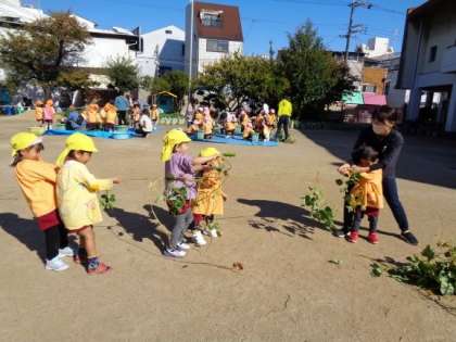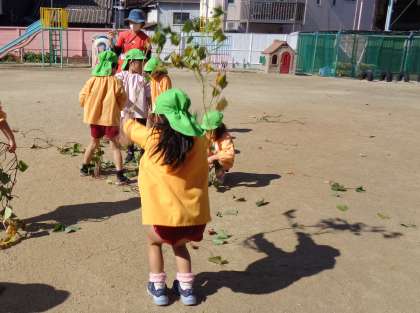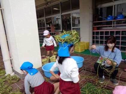 収穫したイモのツルで、縄跳びをしたり、イモのツル引きをしたり、リースをつくったりして遊びました。