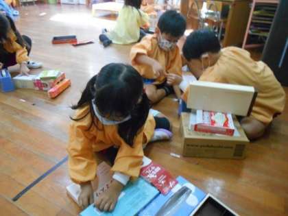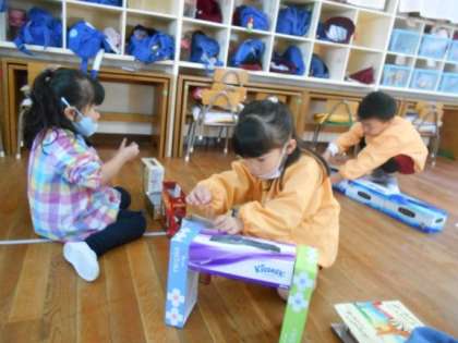 子どもたちはいろいろな素材を使って、動物や乗り物など自分なりにイメージを膨らませてつくって遊んでいます。
