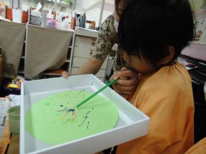 今日の4歳児は、ストローを使った吹き絵も楽しんでいました。