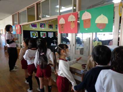 「ひよこ組さんのどんぐり可愛いね」「さくら組さん・たんぽぽ組さんの吹き絵面白いよ」「ゆり組さん・あやめ組さんの作品大きくてかっこいい!」「これはどうやってつくってるのかな?」など興味津々に見ていました。