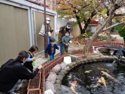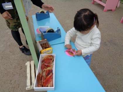 木の実や葉っぱを使ってメダルづくりをしたり、鯉にご飯をあげたり、遊具で楽しく遊んだりしました。