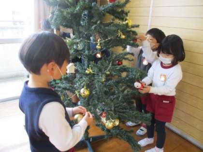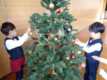 リズム室に入ると大きなツリーがあり、みんなで飾り付けしました。 素敵なツリーに大変身しました☆
