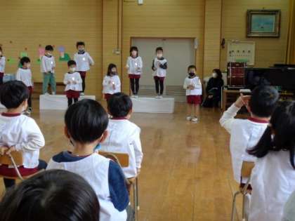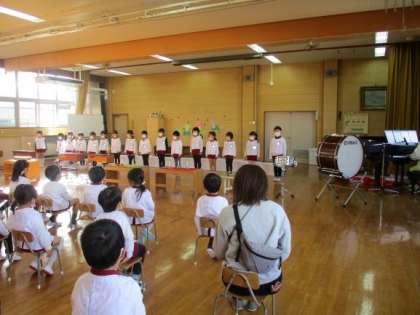 3・4歳児は5歳児の大きな楽器を演奏する姿に「かっこいい」「すごいね」と憧れの気持ちをもつことができました。
