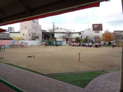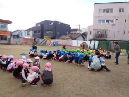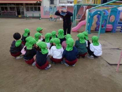 園庭で遊んでいると、ベルの音と園内放送が流れてきました。子どもたちは、遊びやめて、しっかりと話を聞き、ハンカチで鼻と口を覆い、安全な場所へ避難しました。
