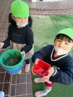 3歳児が「これ何かな」とみつけたると、子どもたちが集まり、「冷たい」「サンタさんのソリに着いたんや」と集めていました。