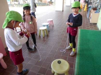 今、幼稚園では、コマ回しや羽根つきなどの正月遊びが大人気です。