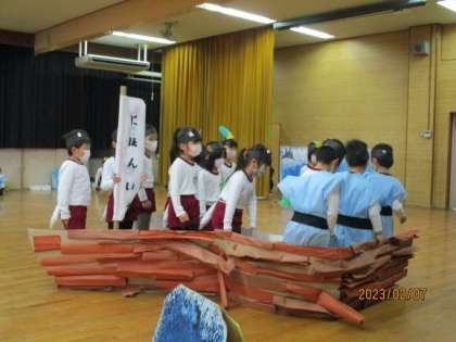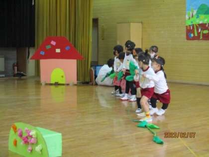 3歳児ひよこ組『おおきなかぶ』5歳児ゆり組『おむすびころりん』あやめ組『ももたろう』を行いました。