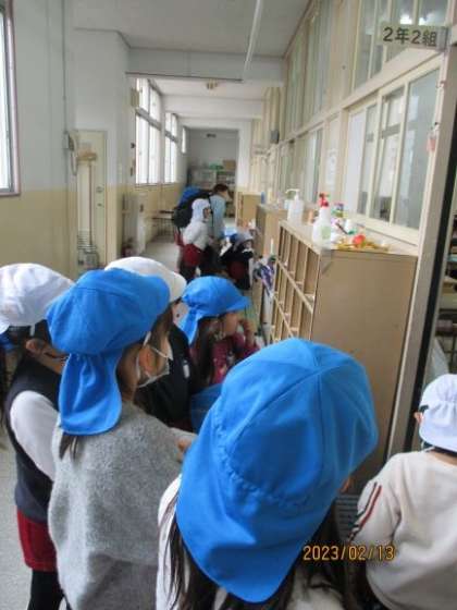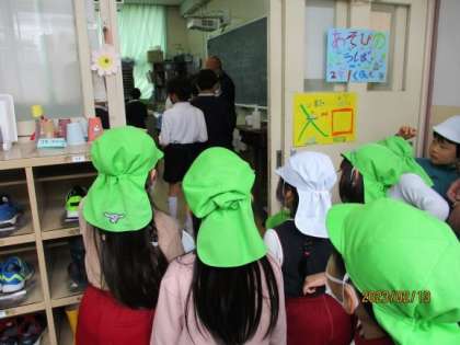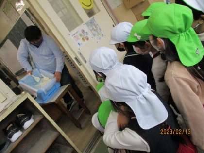 配膳の様子を廊下から見ていると、1年生が「今日の給食はハヤシライスやで」「おいしいよ」と教えてくれました。おかわりをして、美味しそうに食べている小学生を見た園児が、「おなかすいてきたー」(お弁当を食べてから行きましたが・・・)と言い始め、「お弁当食べたやん」と、子供同士で大笑いをしていました。お弁当を食べた後でも、食べたくなるほど、いい匂がしていました。