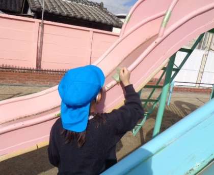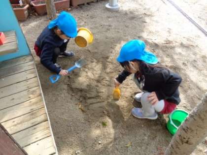 お家の前や園庭の隅などに、へこんでいる所を見つけた、「ここつまずきそう」「埋めた方がいいね」と、砂場から砂を運び、平にしてくれました。園庭の砂がどうしてなくなるのかを考え、「みんながここの砂を使って遊ぶから」ということに気付き、全園児に、「砂で遊ぶ時は、砂場から使うこと」、「使った砂は元に戻すこと」を知らせることにしました。
