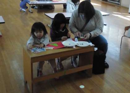 一緒に園庭で遊んだ後、リズム室でひなまつりの製作を行いました。